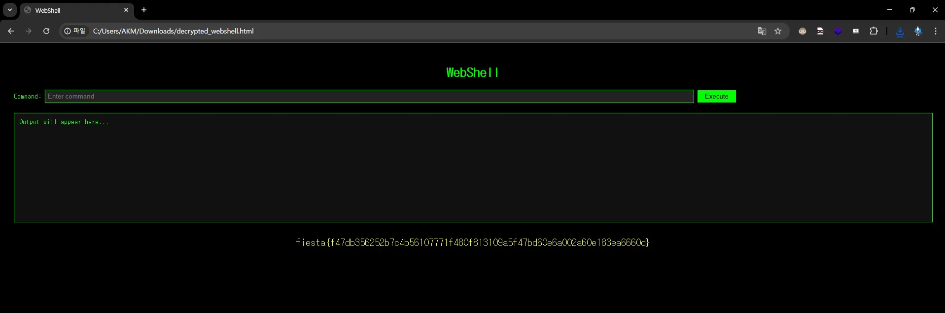 함수가 있고 이를 복호화 하면 웹쉘 코드를 얻을 수 있습니다. FLAG는 웹쉘 코드 내 존재합니다.